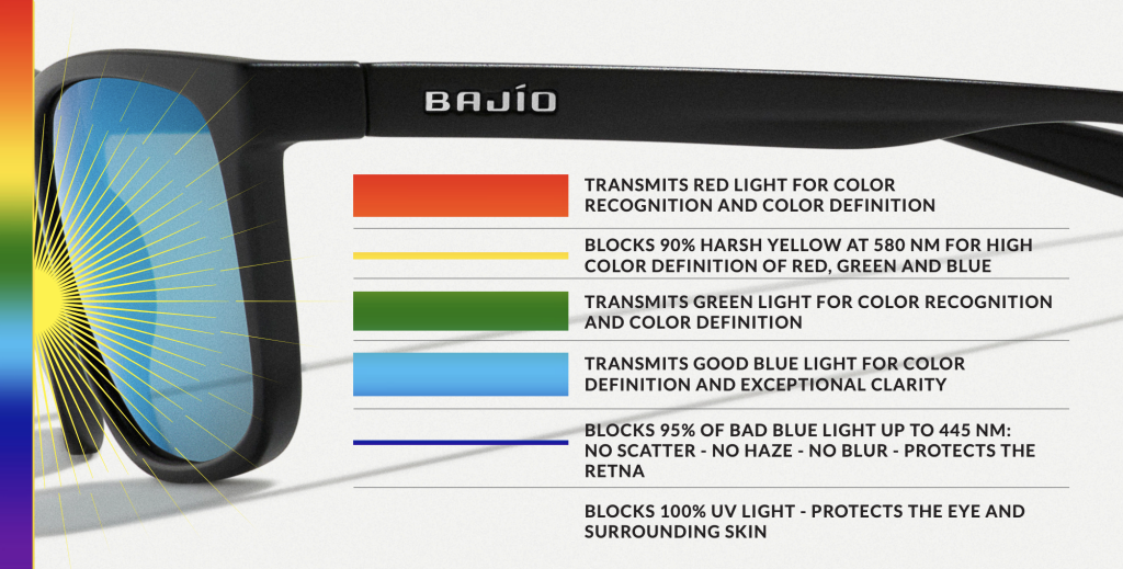 Með því að nota sértækni er Bajío fær um að bæta skýrleika linsunnar, draga úr óskýrleika, glampa og móðu á sama tíma og það eykur lit og verndar augun gegn skaðlegum geislum. Bajío sólgleraugu hindra 95% af bláu ljósi allt að 445 nm og hindra meira blátt ljós en nokkur önnur tegund á markaðnum.