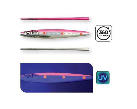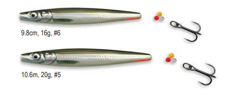 Long slender, knife blade shaped line thru lure in super light zinc alloy. The lure imitates a sandeel perfect and will start to rotate away from the Centerline immediately on spin stop, triggering hard strikes! The lure is designed for long distance casting. Supplied with super sharp SGY trebles.