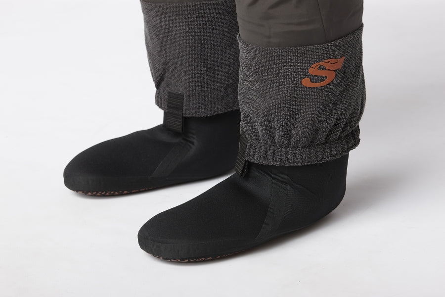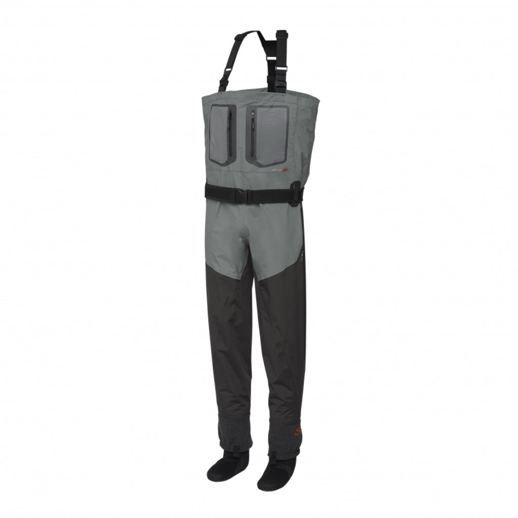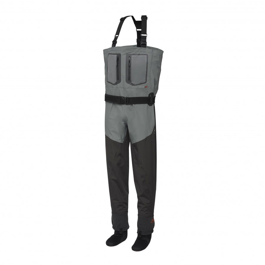 Vandaðar öndunarvöðlur með Ultra Sonic samsuðutækni í stað sauma. Lóðrétt skurðtækni sem auðveldar hreyfingu. Stillanleg axlabönd með smellum til að draga vöðlurnar niður að mitti á heitum dögum. Vatnsheldur innri vasi. Flís fóðraðir renndir handvermis vasar á hliðunum ásamt tveimur stórum lóðréttum renndum möskva vösum fyrir flugubox og tauma að framan. Neoprene mittisbelti með sérstökum bakstuðning og tveimur áföstum D lykkjum til að festa t.d. háf og silungapoka. Áfastar sandhlífar, 4,5mm Neoprene sokkar.
